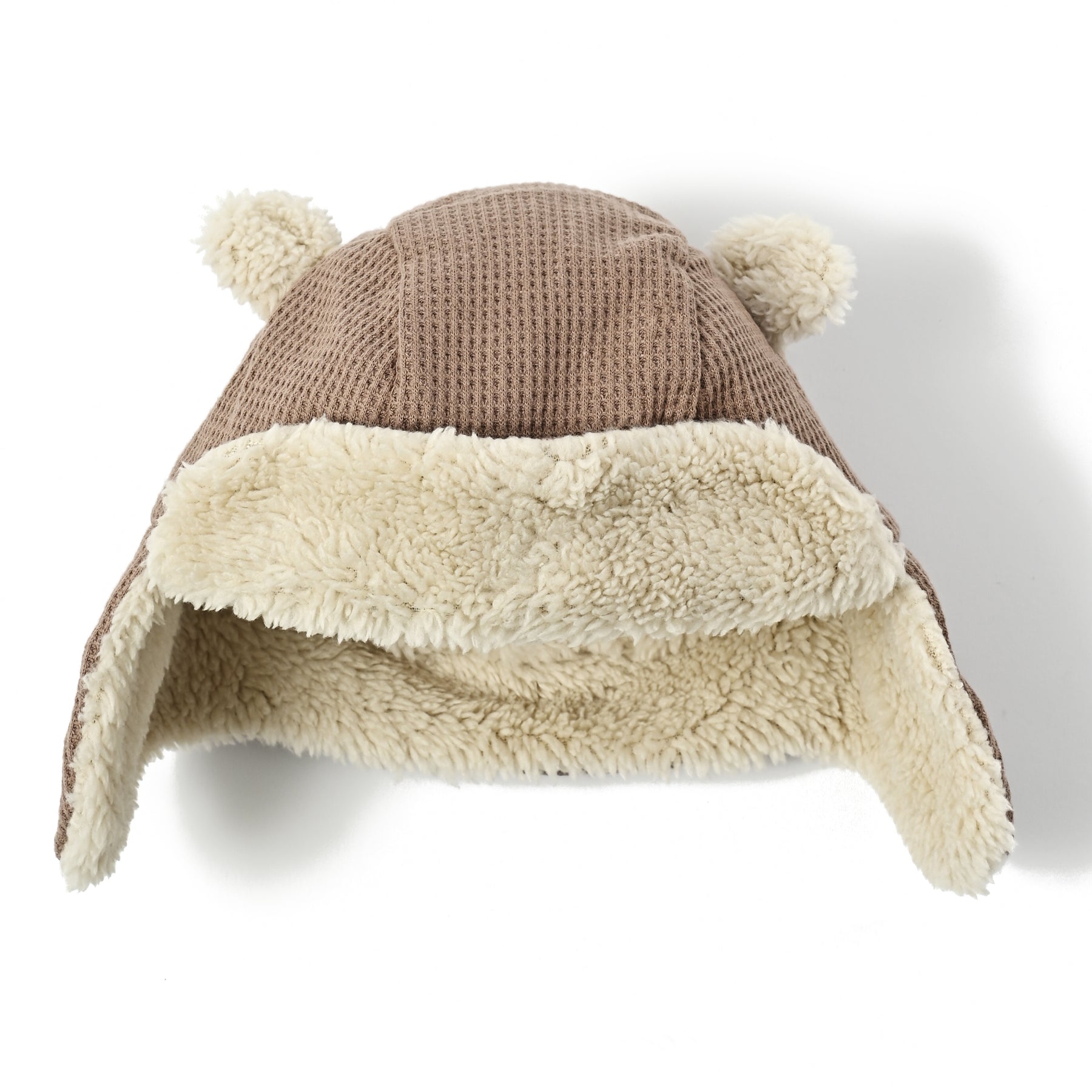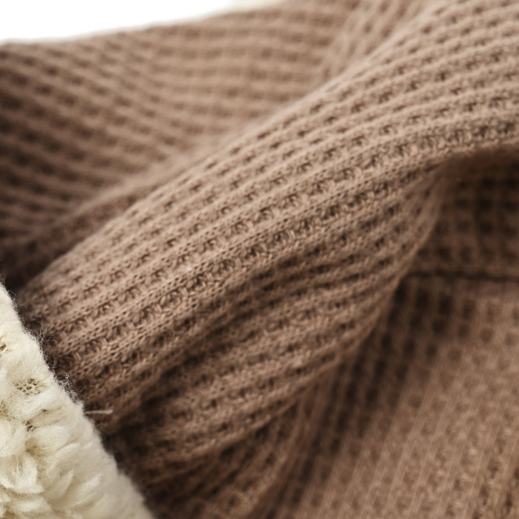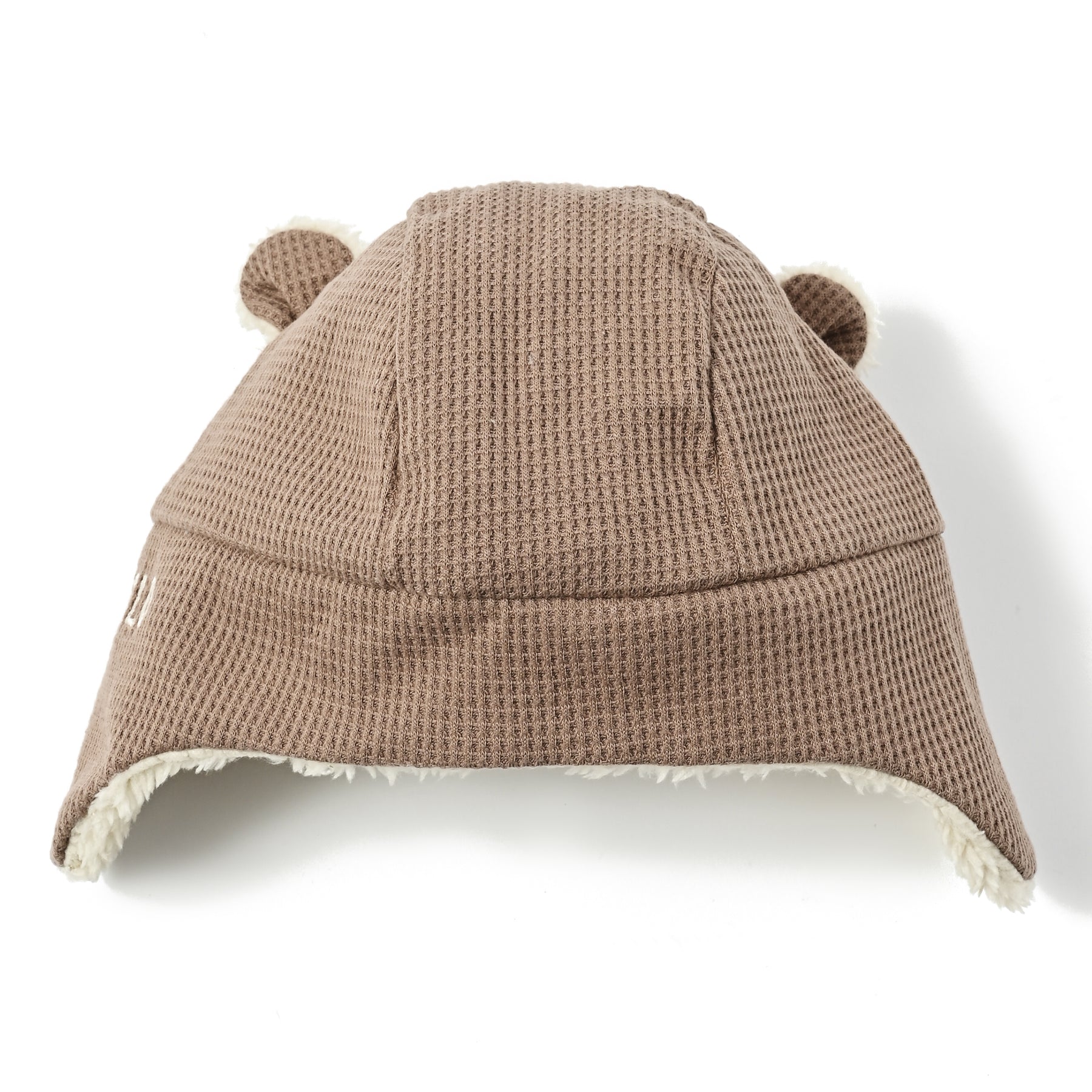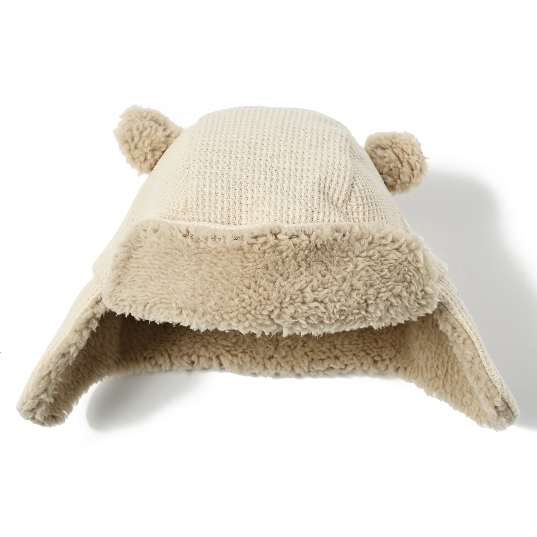 表地はワッフル編みで軽やか、内側はやわらかなボアが頭全体を包み、冷たい風からしっかりガード。